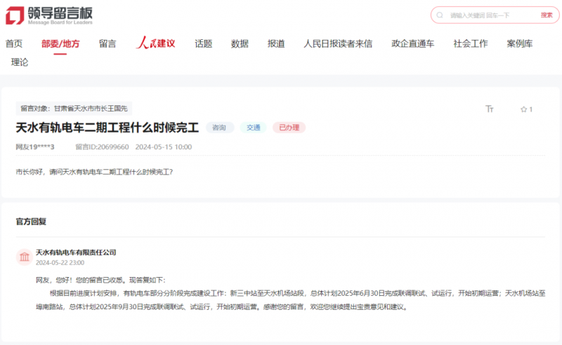 天水有轨电车无限义务公司答复网友天水有轨电